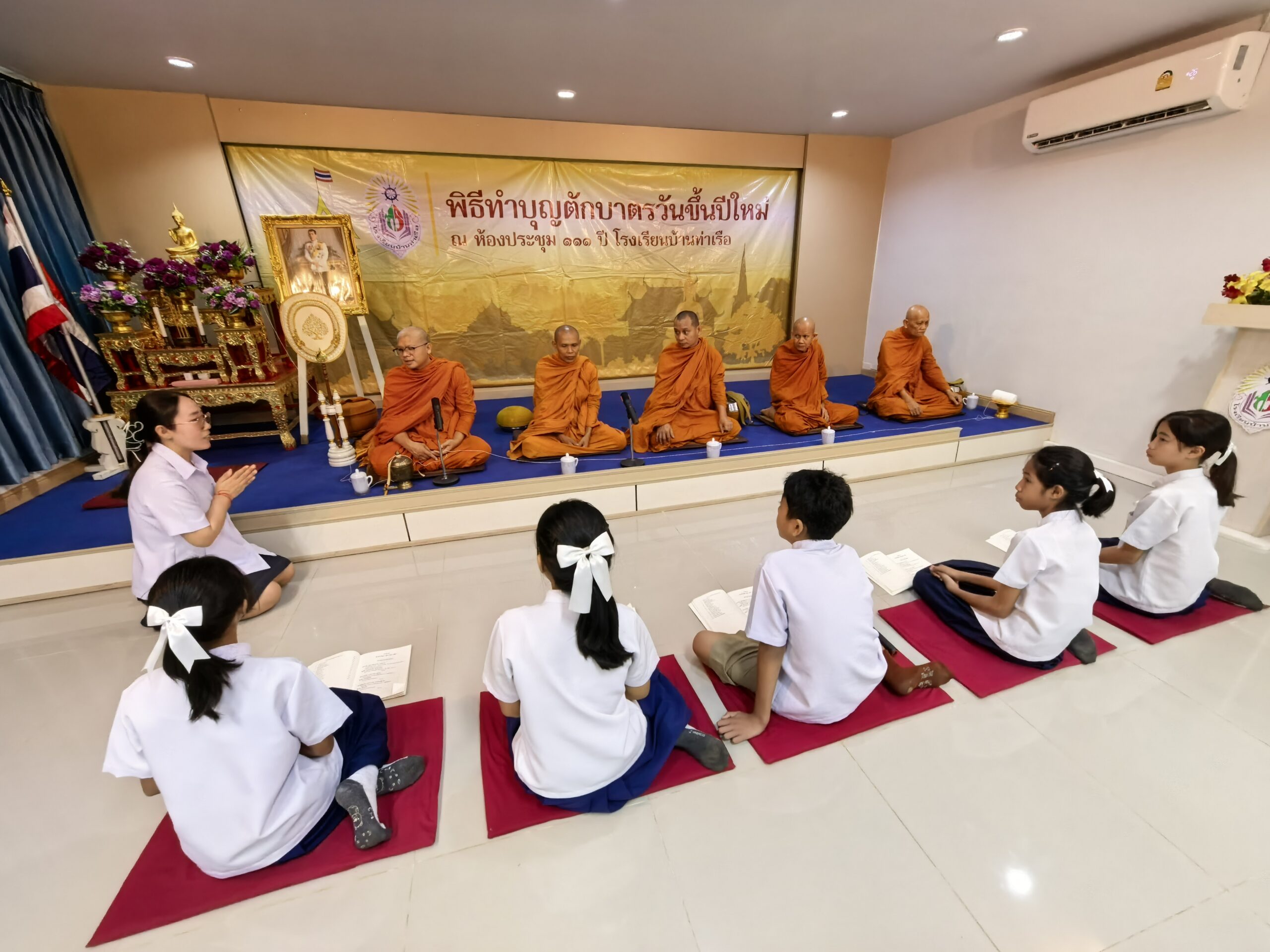 วันพุธที่ ๗ มกราคม ๒๕๖๙ คณะกรรมการสถานศึกษาขั้นพื้นฐาน ผู้บริหารสถานศึกษา คณะครู บุคลากรทางการศึกษาผู้ปกครองและนักเรียน โรงเรียนบ้านท่าเรือ จัดพิธีทำบุญตักบาตรวันขึ้นปีใหม่ ประจำปีพุทธศักราช ๒๕๖๙ โดยได้รับความเมตตาจากพระครูปลัดประกอบ ฉนฺสุโภ ผู้ช่วยเจ้าอาวาสวัดท่าเรือ เลขานุการเจ้าคณะตำบลศรีสุนทร เป็นประธานฝ่านสงฆ์ ในพิธีมีกิจกรรมประกอบด้วย พิธีเจริญพระพุทธมนต์ และพิธีตักบาตรด้วยการนำข้าวสารอาหารแห้ง เครื่องอุปโภค บริโภค ตักบาตรพระสงฆ์ เพื่อเป็นการสืบทอดและนำหลักธรรมคำสอนมาปรับใช้ในชีวิตประจำวัน ถวายเป็นพุทธบูชา สร้างบุญ สร้างกุศล ด้วยจิตใจที่บริสุทธิ์ ต้อนรับศักราชใหม่ เริ่มวิถีชีวิตใหม่ด้วยแสงแห่งธรรมนำทาง ตามแนวทางโรงเรียนวิถีพุทธ ณ ห้องประชุม ๑๑๑ ปี โรงเรียนบ้านท่าเรือ